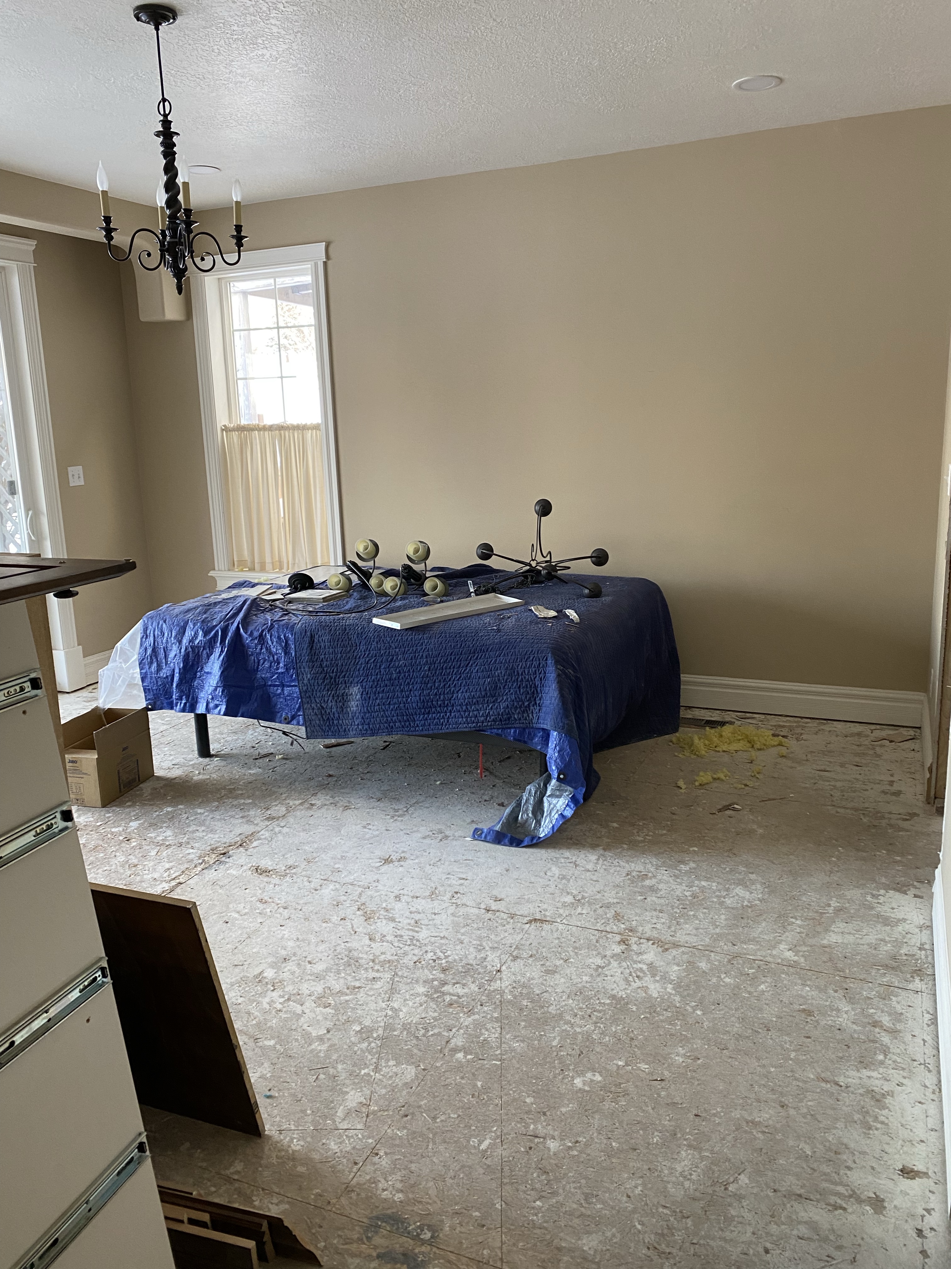 We bought an adjustable bed right when the house closed and it got delivered right away, so we had to work around our bed the entire time too. What a pain… more so for Bryce who had to take all the flooring out and put the new flooring in all while maneuvering this bed around.