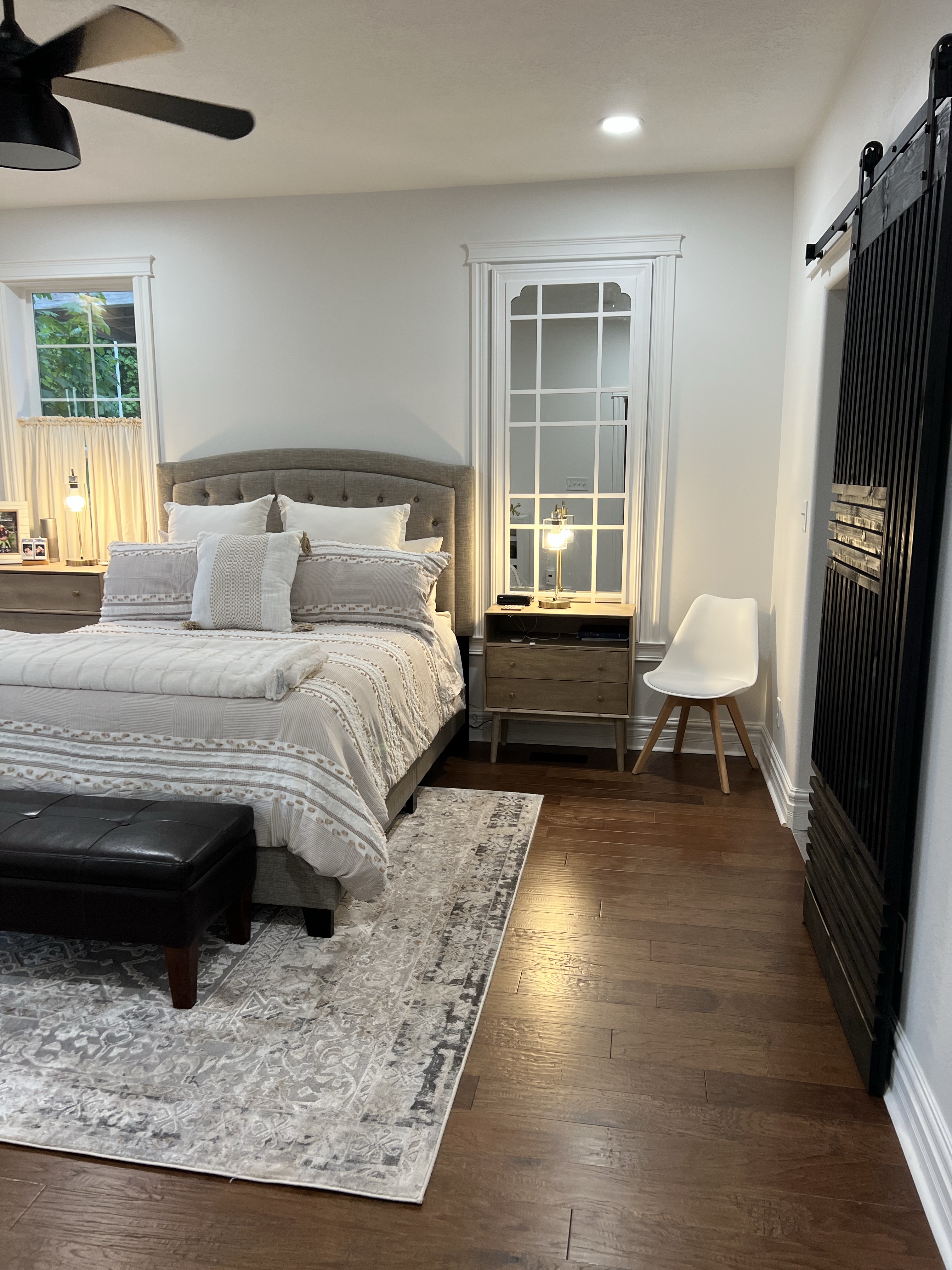 Notice the floors, yep we had to pull them out of here for the kitchen/ entryway, which made me very sad. I decided I would try to find wood floors that would blend well with it so that it still felt cohesive. I was able to find some that worked pretty good. It’s not the same, but it also isn’t so obvious it looks weird or chops up the house. Another thing I did was save some of the moldings we took off the door jambs and saved it to have them frame out a fake window. For some reason it kind of bothered me that there was only one window on the one wall where our bed was going, so I bought a mirror and had it painted to look somewhat like a window to even the room out. I am not sure if this is a dumb thing or not but I think my brain likes it better to be even. We also got rid of our bathroom door and added a barn door.